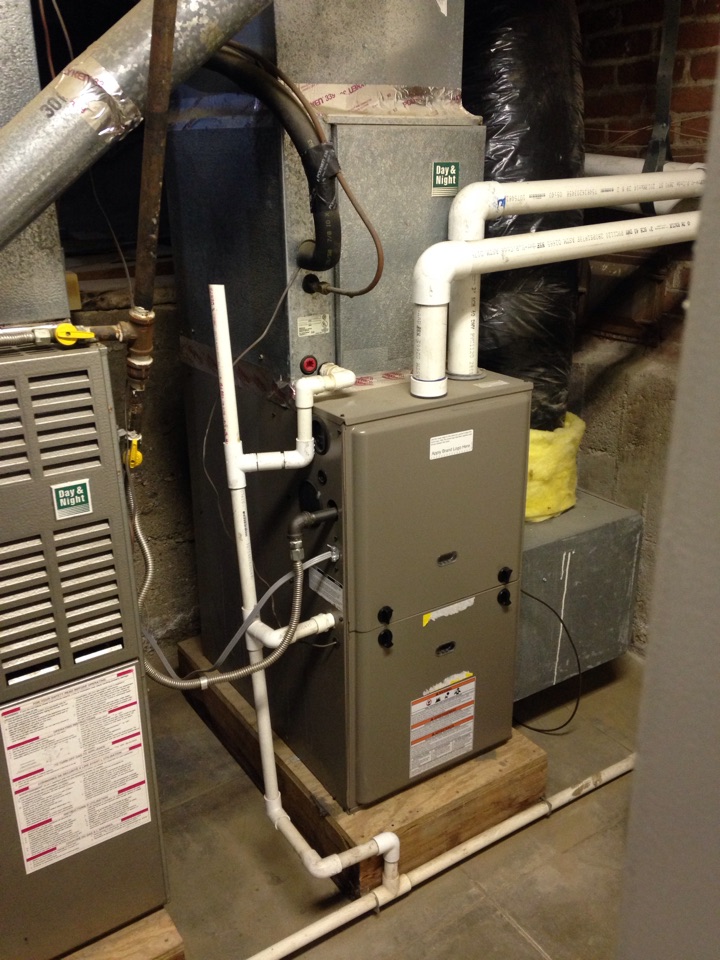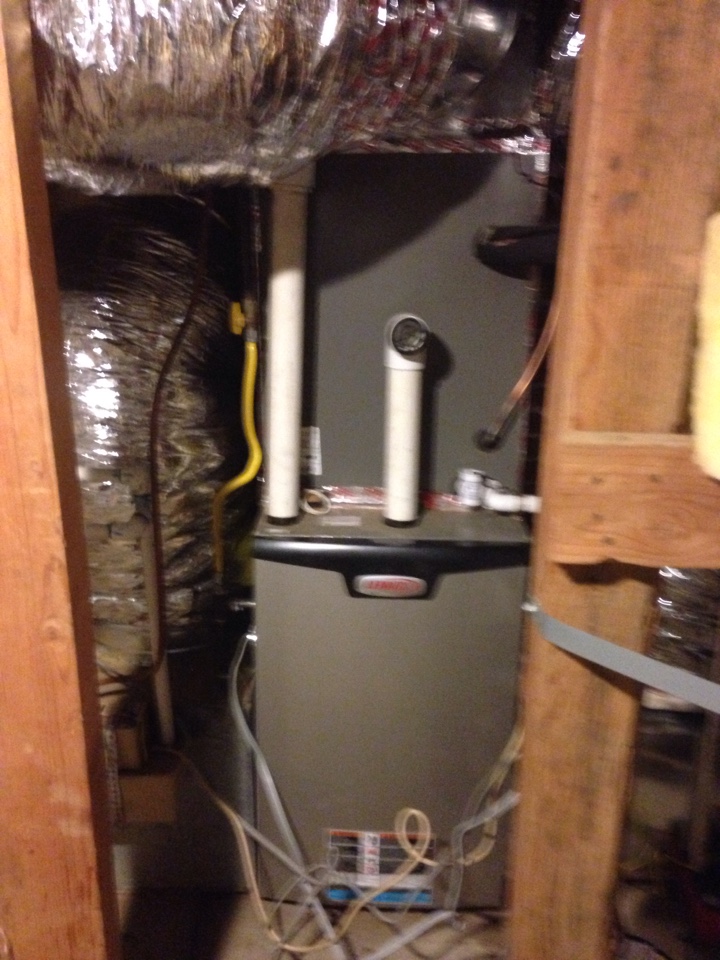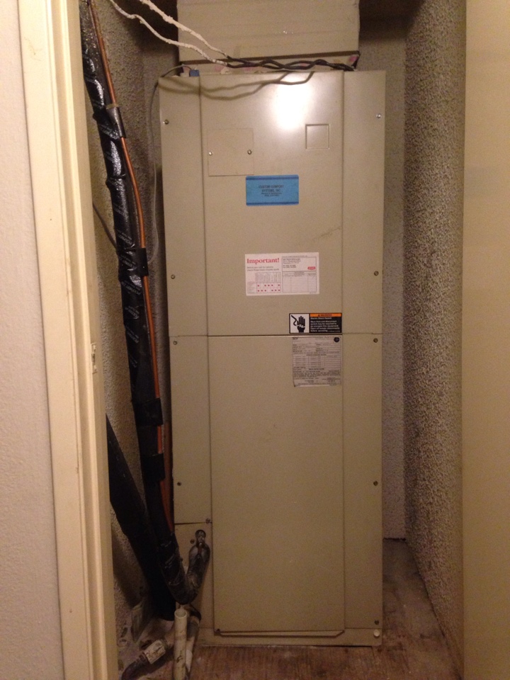 Performed preventative maintenance service on a Payne heating and cooling system. Replaced the filter, checked motors, capacitors, washed coil, cleared drain line, and set thermostat.