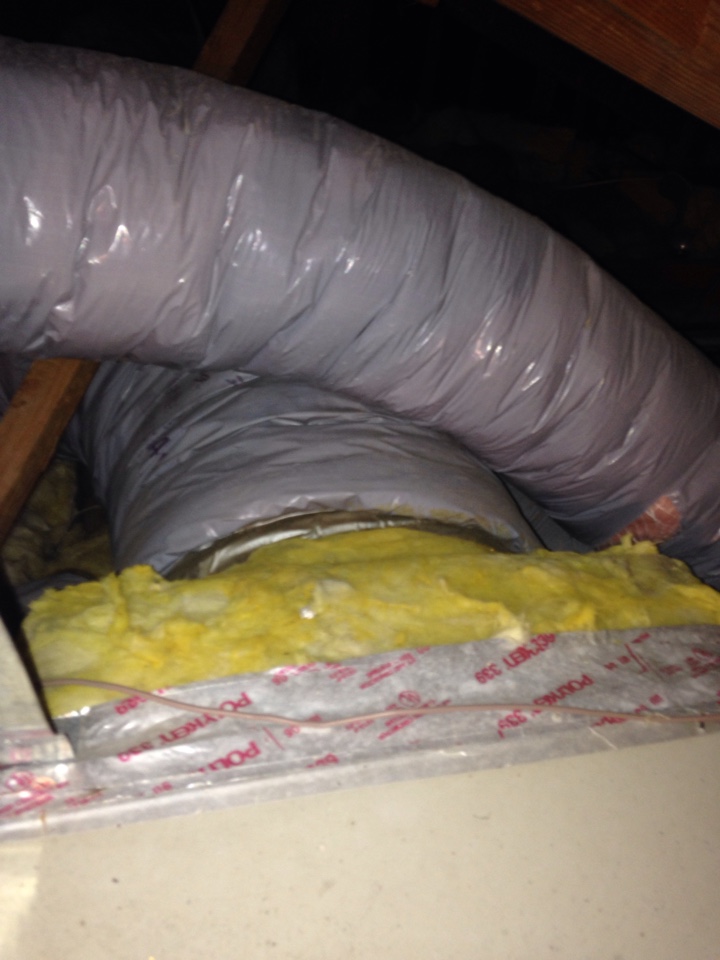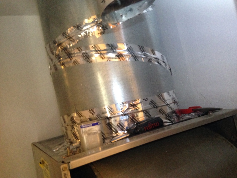 Insulated and sealed air leaks on plenums and start collars for Rheem heating and air-conditioning system.